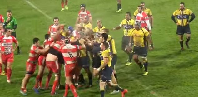 The Federale 1 clubs engaged a in mass brawl sparked by an unceremonious tip tackle delivered to a Nevers player.