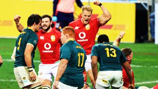 British and Irish Lions players celebrate after winning the scrum during the First Test. (Photo by Ashley Vlotman/Sportsfile)As it turned out, there were three South African tries scored in the second half and ALL of them went to the T.M.O. Only one of them, for Faf de Klerk, stood but scores for Willie Le Roux and Damian De Allende were chalked off. This was despite Australian referee Nic Berry ruling that all three were on-field tries.
