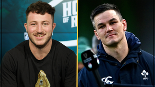 The Leinster flanker is giving his thoughts on a Six Nations victory over Italy, and all under the watchful eye of his captain – at provincial and Test level – Johnny Sexton. The outhalf is waiting to present Connors with the MOTM accoutrement and looking ever bit the proud mother hen.
