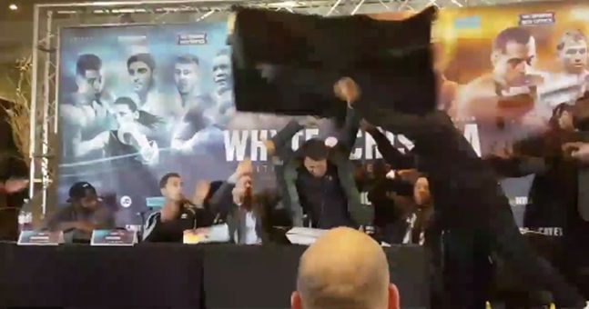 Press conference descends into chaos as Dereck Chisora launches table at Dillian Whyte