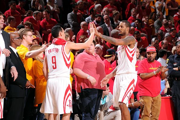 HOUSTON, TX - APRIL 28: The Houston Rockets celebrate during a game against the Dallas Mavericks in Game Five of the Western Conference Quarterfinals during the NBA Playoffs on April 28, 2015 at the Toyota Center in Houston, Texas. NOTE TO USER: User expressly acknowledges and agrees that, by downloading and or using this photograph, User is consenting to the terms and conditions of the Getty Images License Agreement. Mandatory Copyright Notice: Copyright 2015 NBAE (Photo by Bill Baptist/NBAE via Getty Images)
