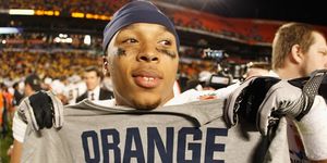 MIAMI GARDENS, FL - JANUARY 04: Stedman Bailey #3 of the West Virginia Mountaineers celebrates after they won 70-33 against the Clemson Tigers during the Discover Orange Bowl at Sun Life Stadium on January 4, 2012 in Miami Gardens, Florida. (Photo by Mike Ehrmann/Getty Images)
