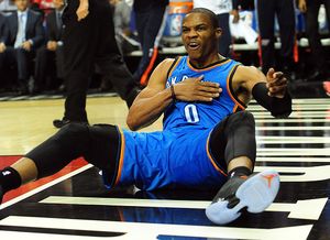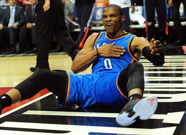 PORTLAND, OR – OCTOBER 29: Russell Westbrook #0 of the Oklahoma City Thunder celebrates after scoring in the first quarter of the game against the Portland Trail Blazers at Moda Center on October 29, 2014 in Portland, Oregon. NOTE TO USER: User expressly ackowledges and agrees that by downloading and/or using this photograph, user is consenting to the terms and conditions of the Getty Images License Agreement. (Photo by Steve Dykes/Getty Images)