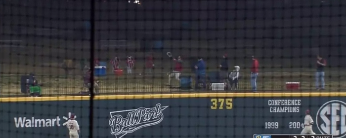 Well, this fan of the Arkansas Razorbacks college team found himself in just that moment, when he was sitting past the boundary, and a Louisiana hitter blasted one over the fence.