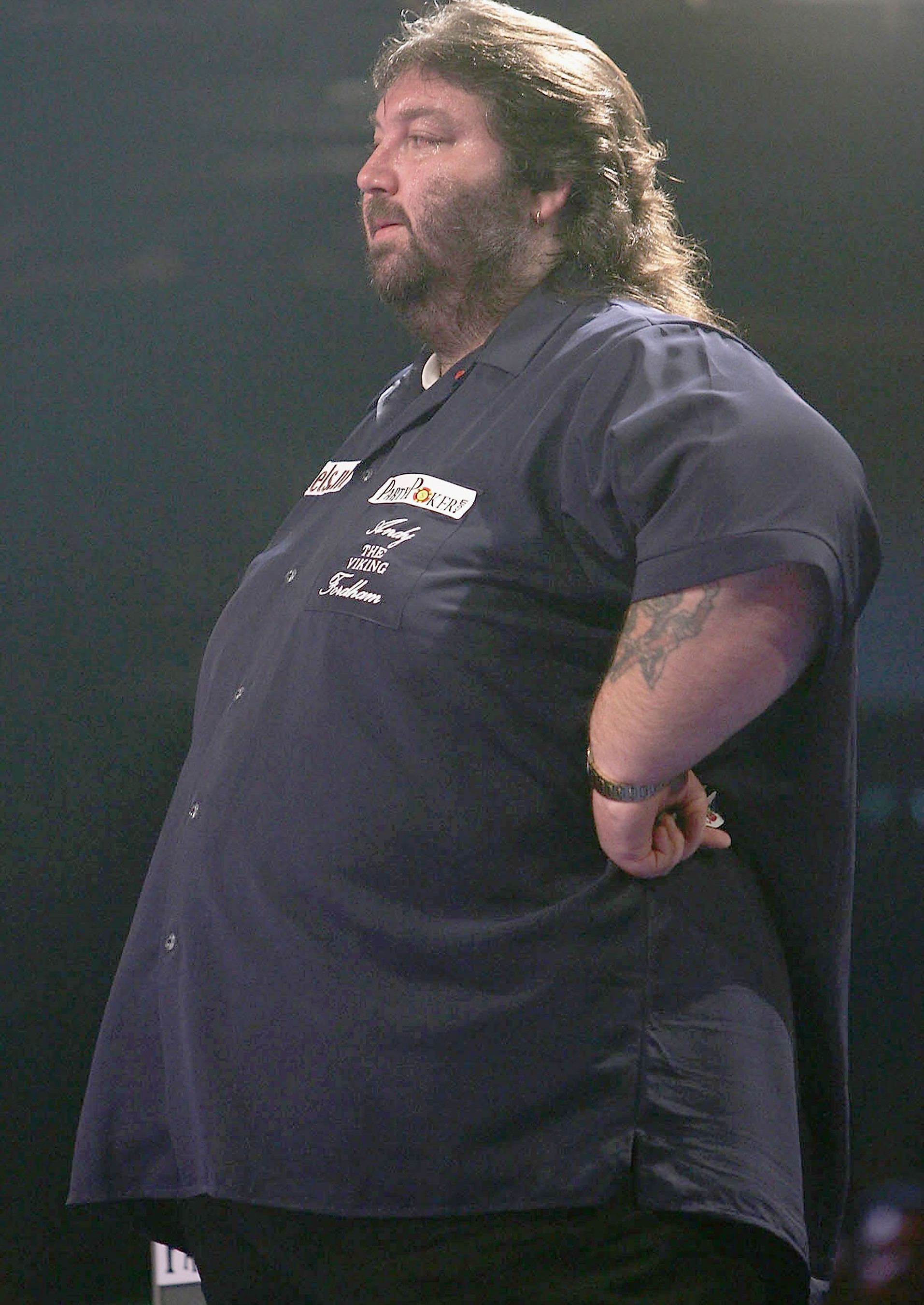 PURFLEET, ENGLAND - NOVEMBER 21: Andy Fordham waits his turn to throw during the Showdown match between Phil Taylor and Andy Fordham at The Circus Tavern on November 21, 2004 in Purfleet, England. (Photo by Christopher Lee/Getty Images)