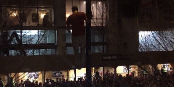 Five people were arrested on Madison’s State Street, and we expect this lunatic was probably one of them, after he jumped down to the pavement from the top of a streetlight.