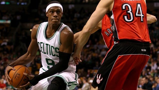 BOSTON, MA – NOVEMBER 05: Rajon Rondo #9 of the Boston Celtics drives against Greg Stiemsma #34 of the Toronto Raptors in the first half at TD Garden on November 5, 2014 in Boston, Massachusetts. NOTE TO USER: User expressly acknowledges and agrees that, by downloading and or using this photograph, User is consenting to the terms and conditions of the Getty Images License Agreement. (Photo by Mike Lawrie/Getty Images)