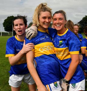 21 August 2021; Aoife Gillen, left, Meadhbh Deeney and Niamh McGettigan of Wicklow, right, celebrate after the TG4 All-Ireland Ladies Football Junior Championship Semi-Final match between Wicklow and Limerick at Joe Foxe Memorial Park, Tang GAA Club in Westmeath. Photo by Ray McManus/Sportsfile