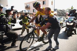 German rider Tony Martin was nursing a 12-second overall lead over Chris Froome in the Tour de France as he cycled the final 900m in stage six today. But then, inexplicably, the yellow jersey-wearer careened to his right and brought down a plethora of pros in a farcical crash.
