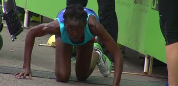 The Kenyan is visibly in distress, her knees bloodied and her eyes fixed ahead of her, but she waves off assistance and completes the excruciating crawl to the finish in third place.