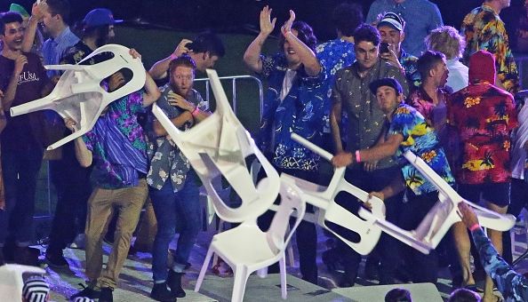 MELBOURNE, AUSTRALIA – JANUARY 10: Spectators throw chairs and tables during the final between Simon The Wizard Whitlock and Mighty Michael van Gerwen during the Invitational Darts Challenge at Etihad Stadium on January 10, 2015 in Melbourne, Australia. (Photo by Scott Barbour/Getty Images)
