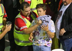 MELBOURNE, AUSTRALIA – JANUARY 10: An injured spectator is assisted by a security guard after chairs and tables were thrown by spectators during the final between Simon The Wizard Whitlock and Mighty Michael van Gerwen during the Invitational Darts Challenge at Etihad Stadium on January 10, 2015 in Melbourne, Australia. (Photo by Scott Barbour/Getty Images)