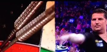 The Flying Scotsman, who is currently slugging it out with legendary Darts player Phil “The Power” Taylor was one dart away from 180 when disaster struck. His third dart knocked the other two off the board, giving him a big fat zero from all three throws. Taylor, ever the professional, added insult to injury by immediately firing back with 180, and the next two legs.